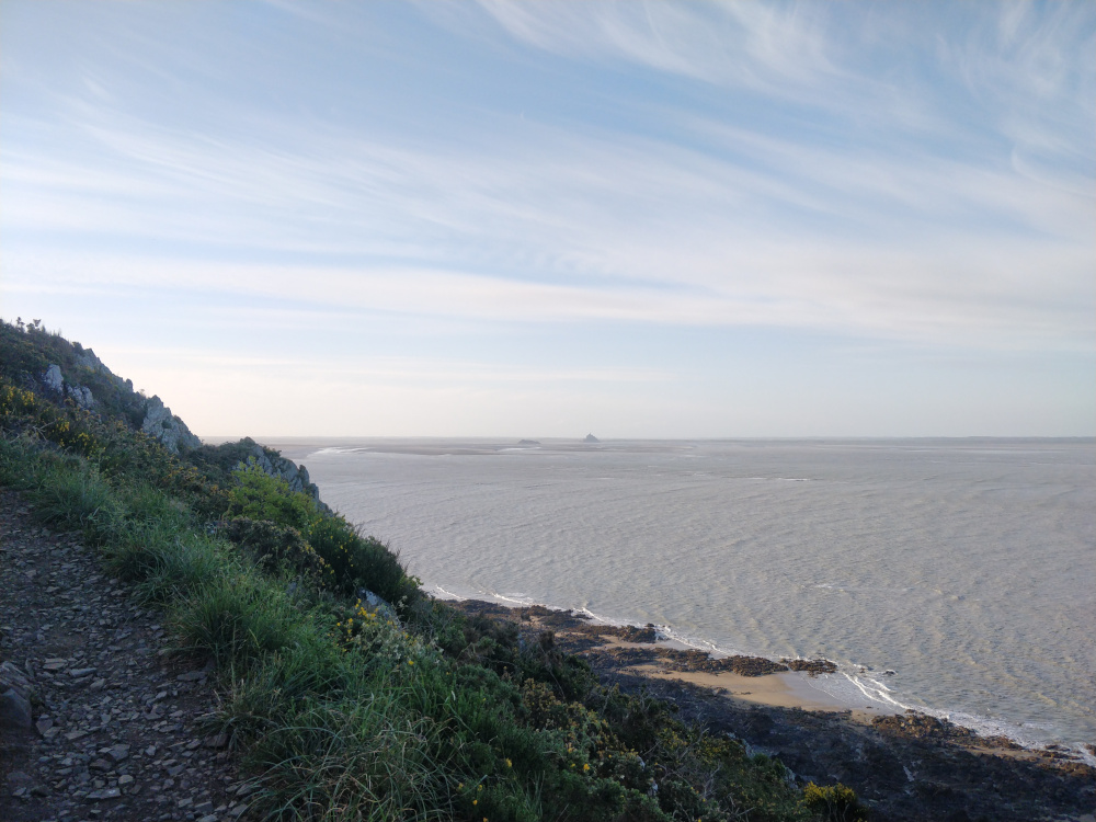 On quitte les Genêts sous un ciel changeant. Le soleil nous accompagne jusqu’à la pointe Saint-Léonard, puis la pluie prend le relais. Ça tombe bien, il fallait que l’on teste nos ponchos. La rando se poursuit tranquillement entre pluie et éclairci jusqu’à la gare d’Avranches où l’on retrouve la voiture.